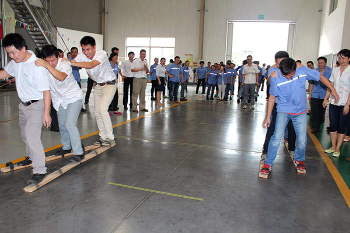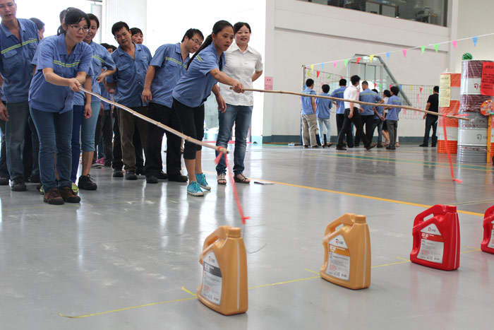 ? ? ? ? 9月25日下午15:00整,隨著一聲響亮的哨聲,游園活動在調油車間正式開始。點球大戰(zhàn)、投籃高手、大步流星、眼疾手快、猜謎、繞口令這些趣味十足的游戲讓員工們玩的不亦樂乎。彰顯團隊凝聚力的拔河比賽最為精彩,隊員們都咬緊牙關,使出全身力氣,都想在緊張激烈的力量拉鋸戰(zhàn)中勝出,觀眾的加油吶喊聲連綿不斷,現(xiàn)場氣氛熱烈至極,獲勝的隊伍歡呼雀躍,擊掌慶祝。