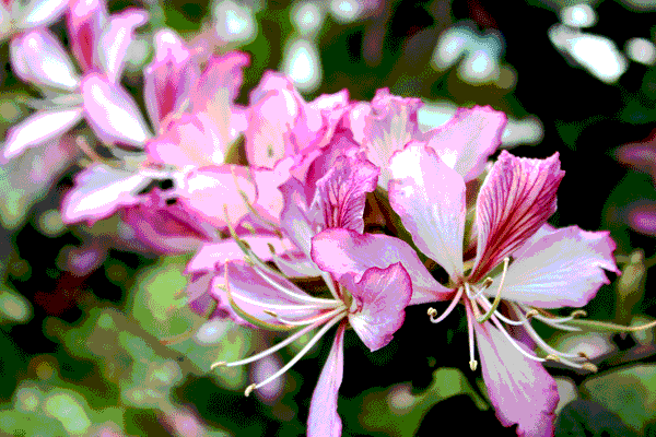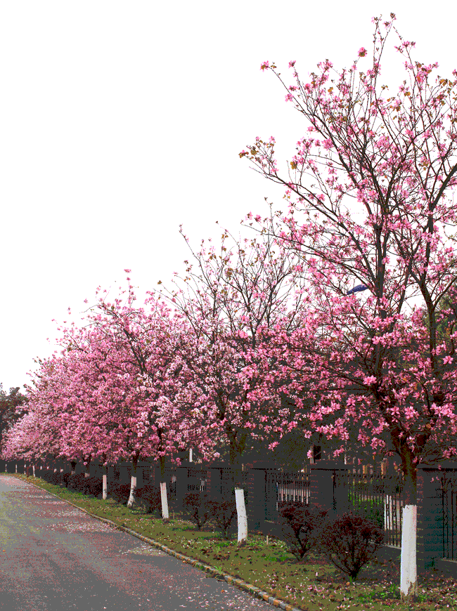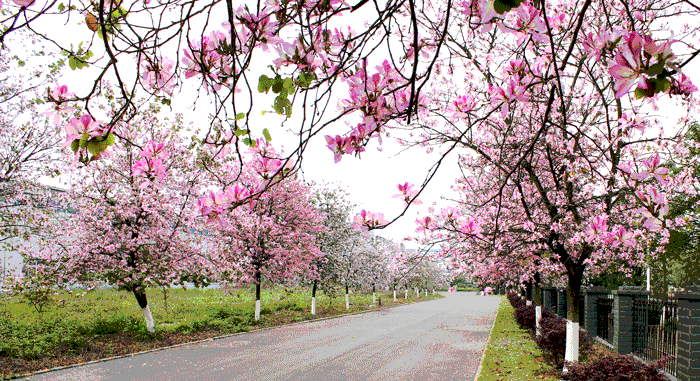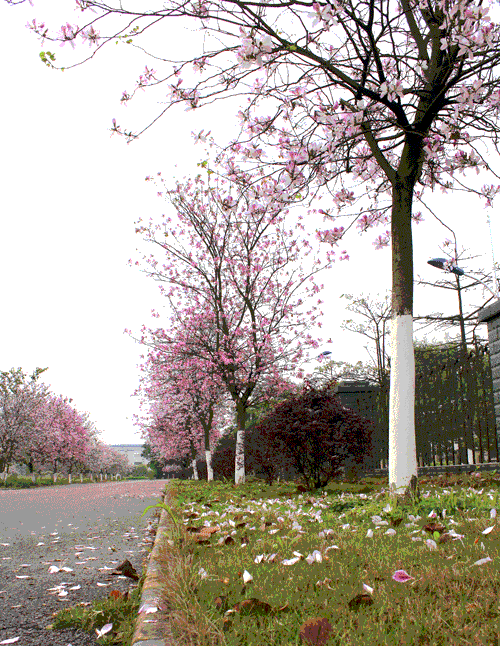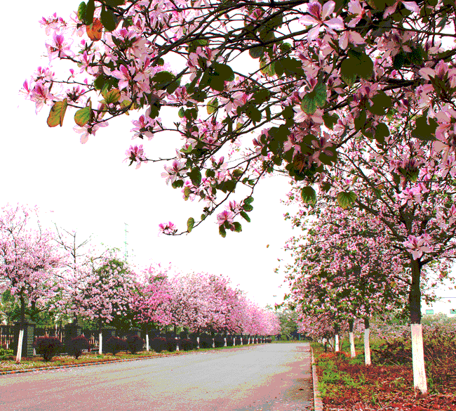 紫荊花的走道,一棵一棵的紫荊花樹,一朵一朵的紫荊花朵,立在走道的兩旁,特別有情趣、浪漫。紫荊花,怒放著,絢麗多彩。