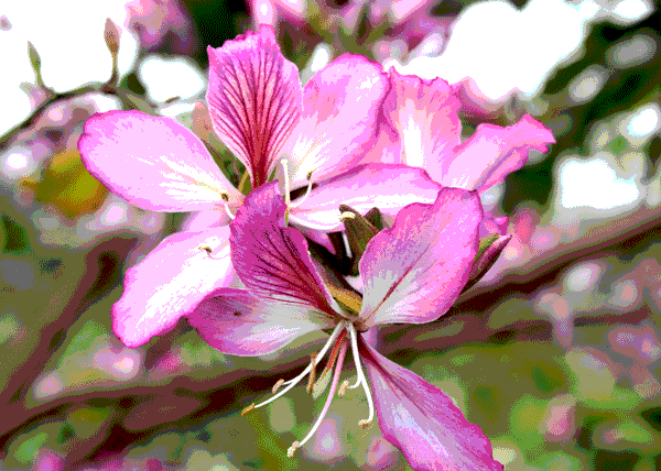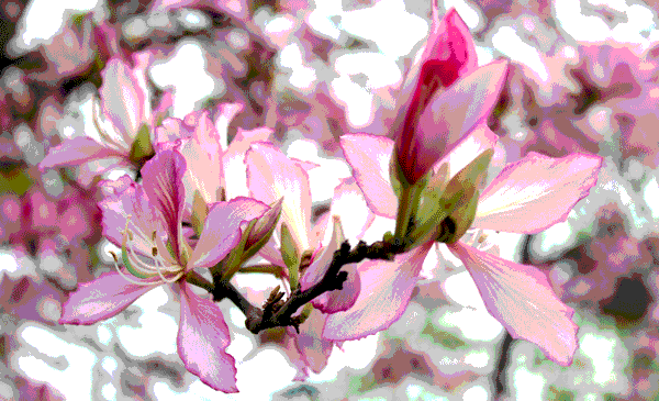 紫荊花花大如掌,略帶芳香,紅色或粉紅色的五片花瓣均勻地輪生排列,十分美觀。